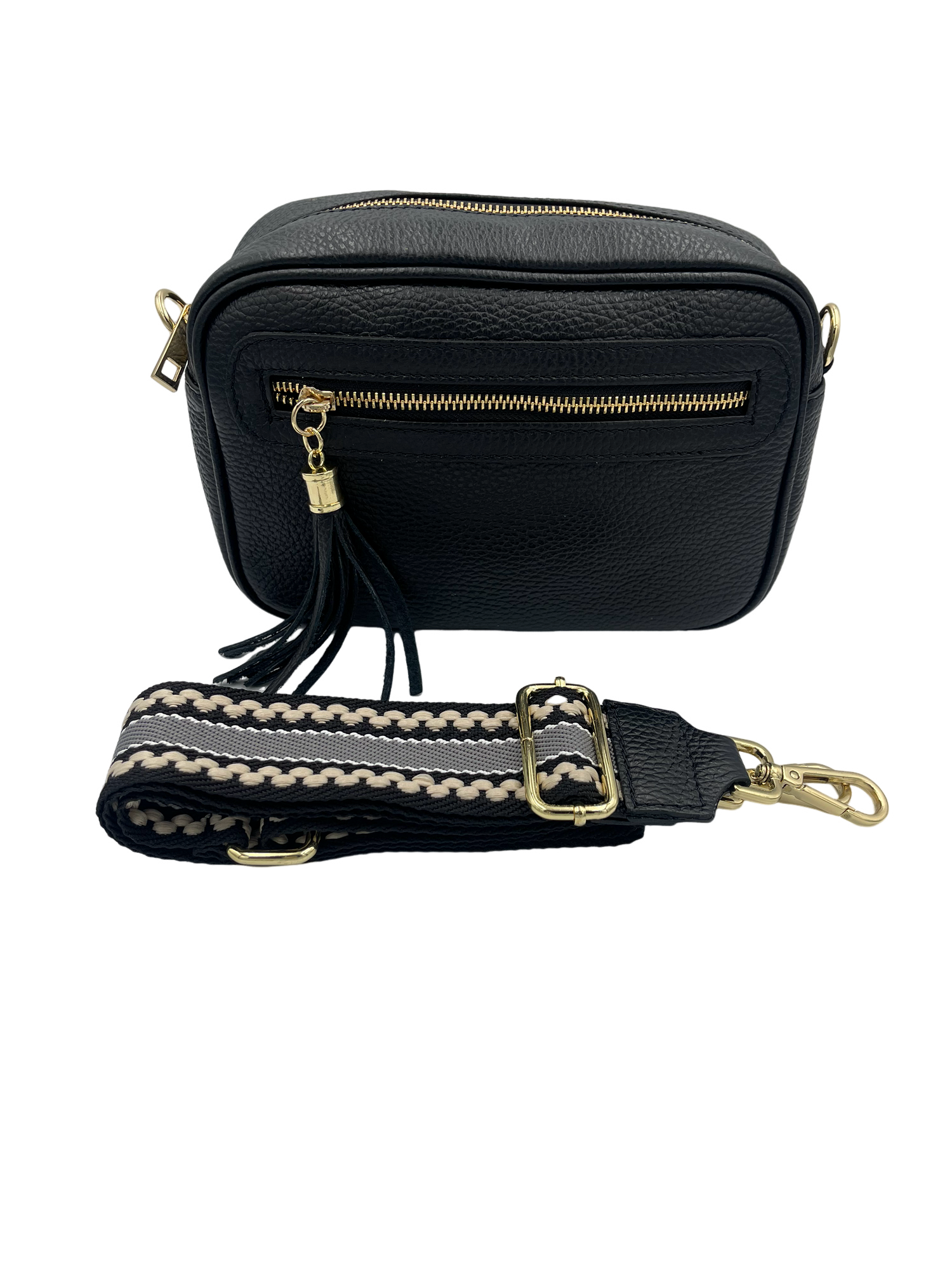 Tassel Crossbody Bag - black with black/cream strap