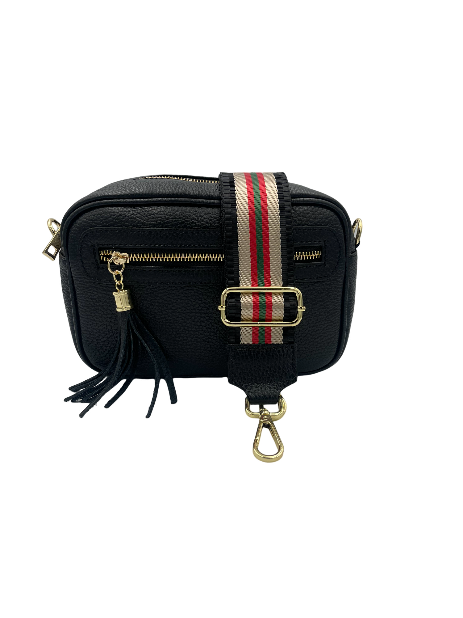Tassel Crossbody Bag - black with black/red/green/cream strap